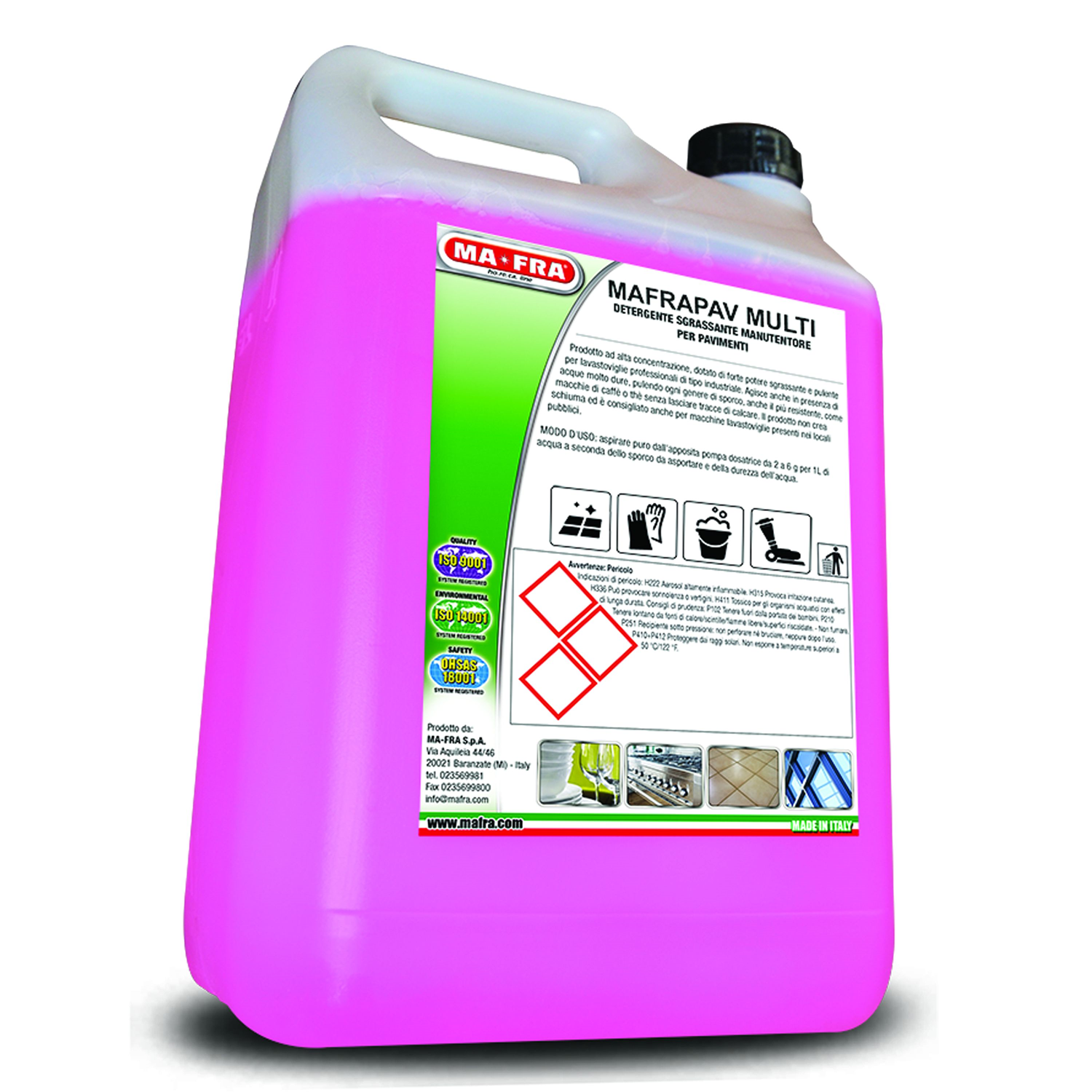 MAFRAPAV MULTI ist ein schaumarmer Bodenreiniger mit Lösungsmittel, geeignet für alle Arten von Schmutz. Seine spezielle Formulierung ist für Wasch-Trockenautomaten geeignet. Es beschädigt keine Aluminiumteile, Vakuumpumpen oder das Innere der Reinigungsmaschine.