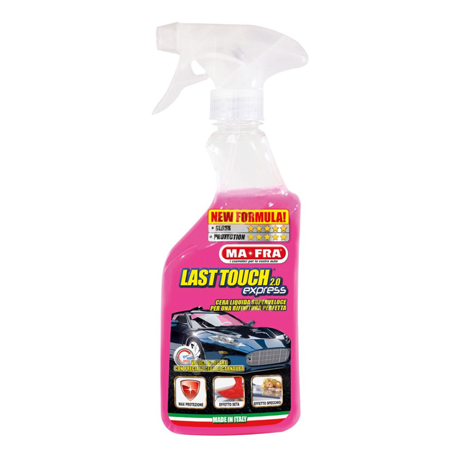 Der superschnelle Flüssigwachs LAST TOUCH EXPRESS 2.0 garantiert in wenigen Augenblicken und ohne jede Mühe, tiefgehende und dauerhafte Reinigung und Glanz, auch bei Regen. Diese innovative Hochleistungsformel, ohne Silikone und reich an wertvollen Carnaubawachsen, schenkt der Carrosserie einen deutlich gesteigerten Glanz, verhindert Schmutzablagerungen, garantiert einen langanhaltenden Schutz und hinterlässt eine seidige Oberfläche. Das Fahrzeug kann in wenigen Minuten behandelt werden, sowohl trocken, als auch nass. Verwendung: LAST TOUCH EXPRESS gleichmässig in kleinen Dosen und in einem Abstand von 20cm auf die zu behandelnden Bereiche aufsprühen. Das Produkt mit einem Mikrofasern-Tuch verteilen und dann mit einem anderen trockenem Tuch trocknen.