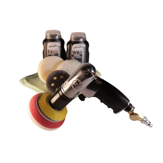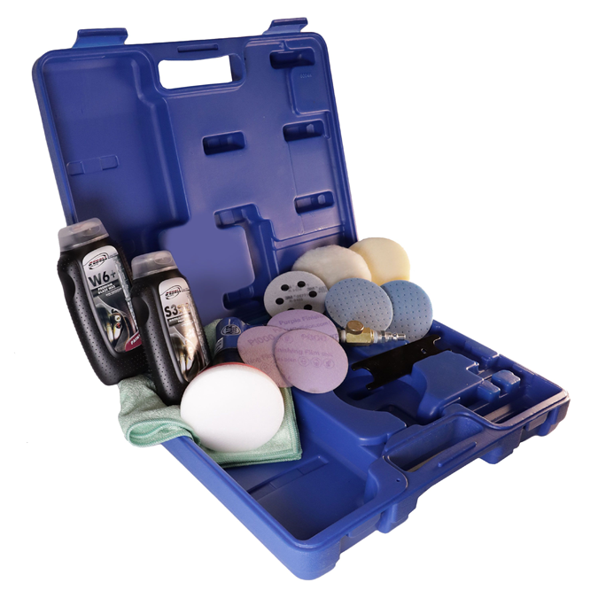 Die pneumatische Mini-Poliermaschine hat einen speziellen Polierteller, welcher besonders für kleinere und abgerundete Oberflächen geeignet ist. Sämtliches Material für die fachgerechte Politur ist in einem handlichen Koffer untergebracht.