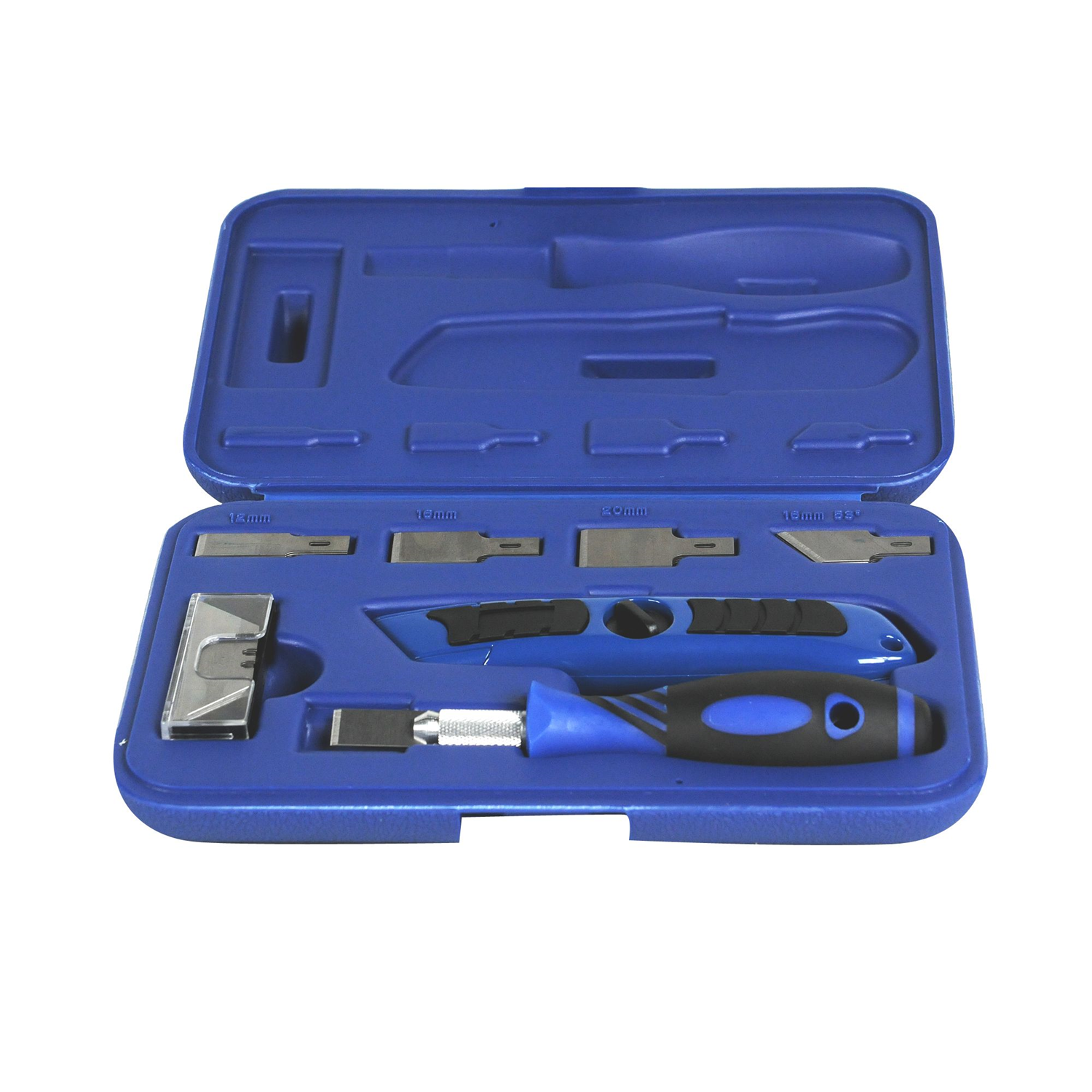 PU-Schaberset zum Zurückschneiden von PU-Raupen, Dichtungsresten und Vignetten. Inhalt: 1 Handgriff, 1 Mehrzweckmesser, je 5 Kingen: 12mm, 16mm, 20mm, 16mm / 53' und Trapez