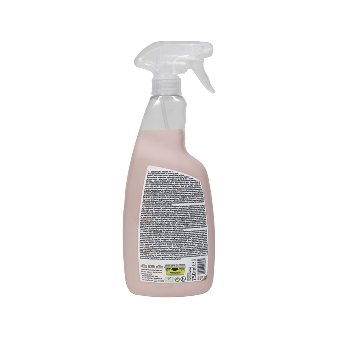 Lustrant protecteur antistatique. Champ d’application: DIAMANTPLAST DRESSING PRO nourrit, ravive et protège les surfaces traitées, en les maintenant propres et brillantes pendant longtemps. Il constitue la solution idéale pour les tableaux de bord, les revêtements plastiques, les sièges en cuir et imitation cuir, en exaltant leur couleur originale. Avantages: Après son application, il forme une pellicule brillante et antistatique de longue durée contre les poussières et le smog. Produit à rendement élevé, il possède un excellent pouvoir ravivant et ne graisse pas. Mode d’emploi et dilutions: Pour nettoyer et lustrer les intérieurs d’autobus, diluer à 50% dans de l’eau.