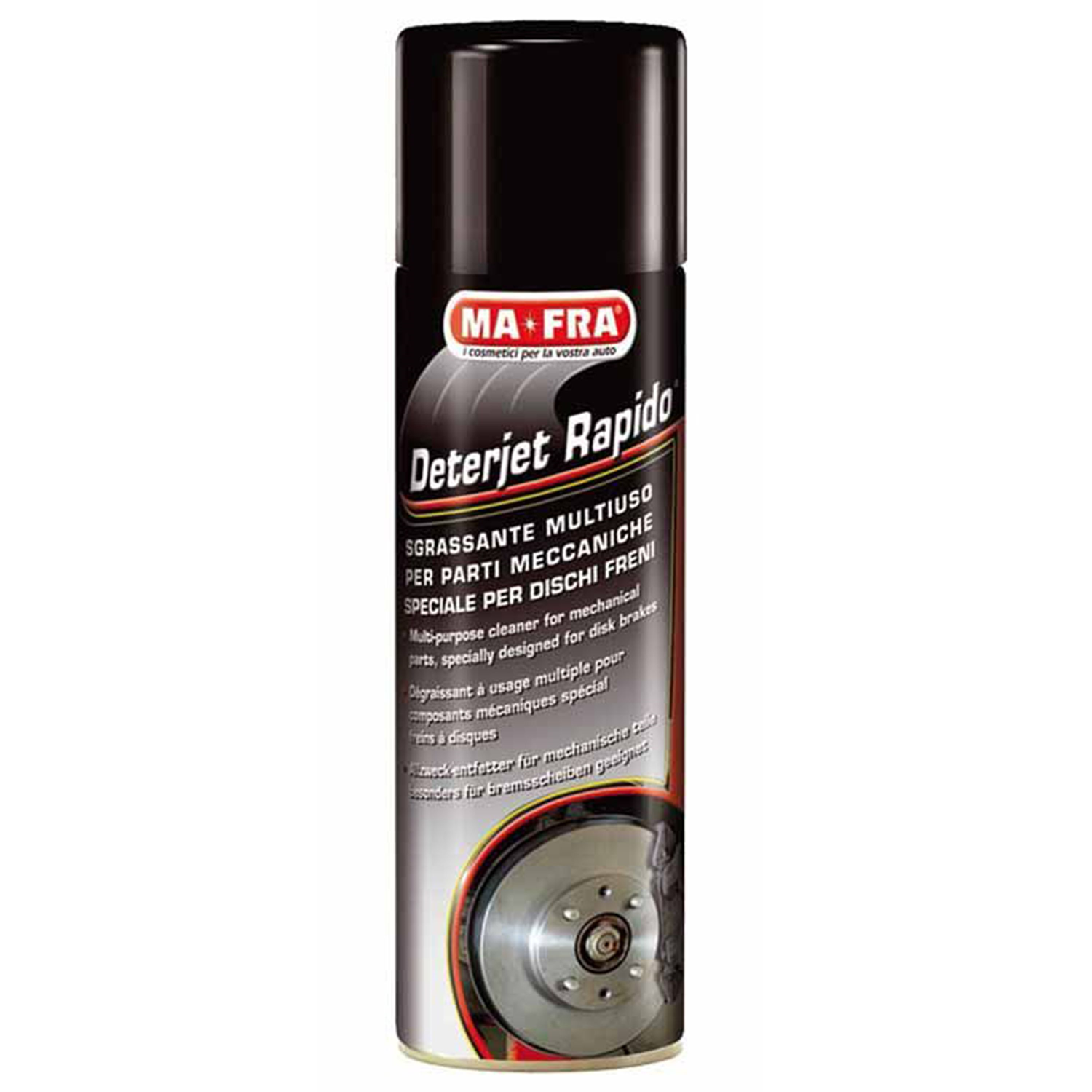 Le dégraissant multi-usage rapide et efficace. Son action est incisive et lui permet de pénétrer en profondeur entre les incrustations, en éliminant rapidement de la partie traitée tout type de saleté, graisse, huile et liquide pour freins, sans jamais devoir démonter les parties à nettoyer. De quoi parlons-nous ? Naturellement du nouveau DETERJET RAPIDO, le dégraissant né dans le Centre R&D Ma-Fra, la méthode la plus efficace de nettoyer énergiquement et très rapidement n’importe quelle partie du groupe de freinage d’un véhicule ou, en général, de machines et de chaînes. Son jet à haute pression doit être dosé au mieux en passant d’une distance initiale par rapport à la partie à traiter de 50 cm pour arriver – après avoir laissé agir le produit – à une distance de 20cm tout en faisant toujours attention que le jet soit dirigé du haut vers le bas. Le produit a un pouvoir dissolvant rapide et après avoir nettoyé à fond, il suffira d’utiliser un simple chiffon pour compléter l’opération.