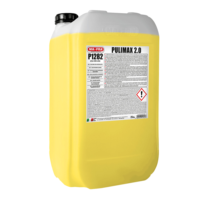 Détergent universel pour l?intérieur des voitures. Champ d?application: PULIMAX super concentré a été étudié spécialement pour nettoyer à la perfection toutes les surfaces lavables de l?intérieur de toutes les voitures, telles que les sièges en skaï et en tissu, le coffre ainsi que toutes les parties en plastique, telles que tableaux de bord et portières. Avantages: Face à n?importe quel problème de saleté, PULIMAX offre la garantie d?une grande propreté, en assurant, en une seule opération, un nettoyage hygiéniquement complet et en éliminant la saleté la plus tenace même des porosités. Il ne demande pas de rinçage. Mode d?emploi et dilutions: PULIMAX est un produit hautement concentré, délayable dans l?eau 1:10 à 1:20, en fonction de la saleté à traiter. Appliquer la solution avec un pulvérisateur manuel, attendre quelques secondes et retirer la saleté avec un chiffon humide.