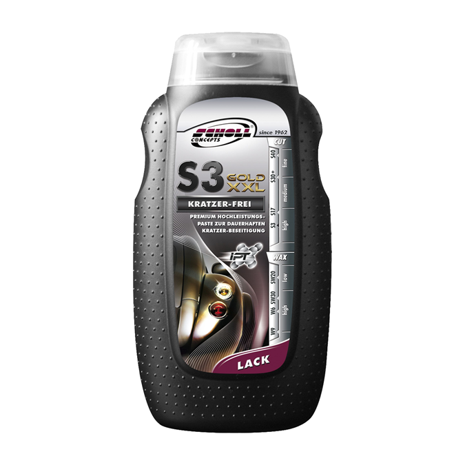 Die Hochleistungs-Schleifpaste S3 Gold wurde speziell für Lackfinish-Arbeiten auf frischen, kratzfesten Lackoberflächen sowie UV-Lacken entwickelt. Dank der einzigartigen intelligenten Pulvertechnologie (iPT) auf Basis eines hochreinen Aluminiumoxides lassen sich Irritationen im Decklack jetzt noch schneller und einfacher auspolieren. Die enorme Abtragsleistung (cut), der brillante Spiegelglanz und das einfache Handling der Hochleistungspaste werden Sie überzeugen.Die Hochleistungs-Schleifpaste S3 Gold lässt sich nahezu mit jeder unserer Polierscheiben (Pads) verarbeiten. Wir empfehlen auf allen Oberflächen den Einsatz des innovativen Sandwich-SpiderPads (schwarz/weiß) bzw. des harten SpiderPads navy-blau ? eine neue Generation von Schaumstoff-Polierscheiben.?Konsequent einfach? ? nur noch eine Paste und eine Polierscheibe für nahezu alle Lackfinish-Arbeiten auf frischen Lackoberflächen!Vorteile: Schleifstellen der Körnung P1500 können in Sekunden entfernt werden - Die Swiss Edition hat mehr Abtragsleistun und ist noch anwendungsfreundlicher - Maximalem Glanz bei maximaler Abtragsleistung - Kein Antrocknen der Paste beim Polieren - Intelligente Pulvertechnologie (IPT) - In Kombination mit dem intelligenten Sandwitch-SpiderPad ist die Hitzeentwicklung beim Polieren minimal - Bestens geeignet für alle Lackarten auch kratzfeste & UV-Lacke - Paste ist frei von Wachsen, Silikonen und übel riechenden Lösemitteln - Bestens geeignet für Polycarbonat- und Holzfinish-Arbeiten