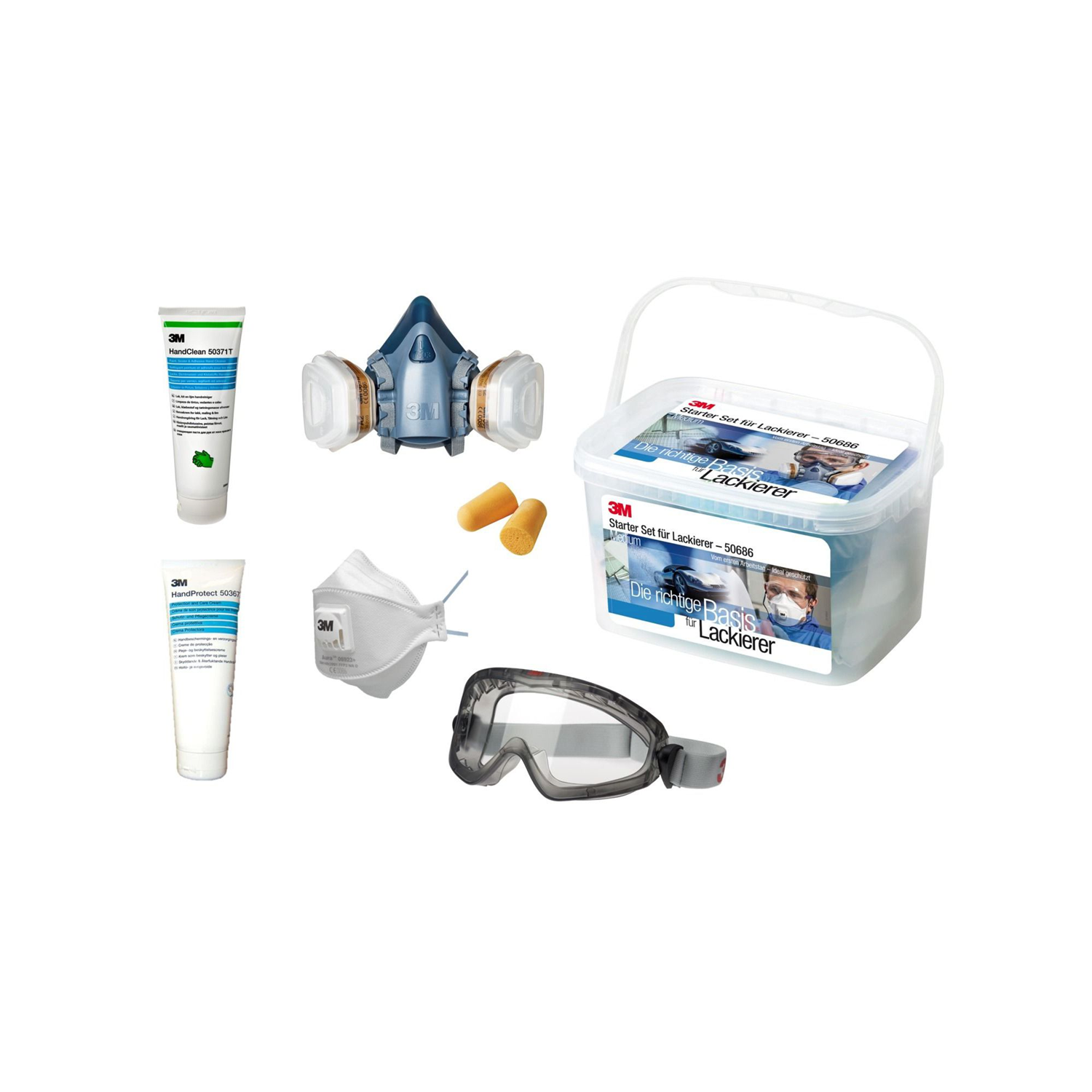 Equipement de base pour peintre - matériel de sécurité au travail et d'information afin d'être correctement protéger dès le premier jour de travail. Le set comprend: 1 x masque Serie 7500, 2 x filtres charbon actif A2, 4 x filtre à particules P3, 10 x tissu de nettoyage 2 x bagues pour filtres 2 x Aura? masque à filtre FFP2, 1 x 2890SA, lunettes à vision intégrale premium, 1 x crème de protection et de soin, 1 x Hand Clean nettoyage de la peau, 2 x bouchons d'oreilles